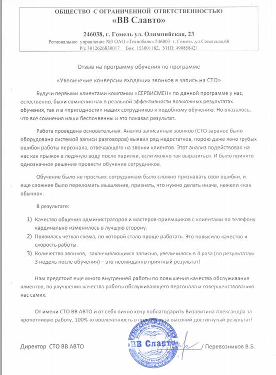 СКАЧАТЬ ПРОГРАММУ ... ![]() Программа «КЗ» «КОНВЕРСИЯ ЗВОНКОВ В ЗАПИСЬ» Программа предназначена для увеличения загрузки предприятия автосервиса (СТО) путем повышения конверсии входящих телефонных звонков в запись В программе целесообразно участие специалистов: • Мастеров-приёмщиков/консультантов, администраторов, специалистов по подбору запасных частей автосервисных предприятий Задачи программы: 1) тестирование канала входящих звонков до и после обучения 2) разработка схемы автоматизации и записи звонков 3) корректировка/ разработка скриптов для приема звонков 4) постановка целей и задач для специалистов приемки при работе с входящими звонками 5) обучение и корректирование действий специалистов приемки при работе с входящими звонками СОДЕРЖАНИЕ КУРСА: 1. Постановка проблемы - роль обработки входящих звонков в работе СТО - «мы вам звонили» результаты нашей проверки вашего автосервиса - конверсия звонков на сегодня, а есть ли проблема - для чего мы учимся и зачем нам это нужно 2. Программа обучения и внедрения изменений 3. Рекомендации руководителю - что нужно для качественной работы с входящими звонками - что нужно для успешных продаж услуг СТО - техническая подготовка производства (телефонизация/ запись и управление звонками, CRM) 4. Ключевые процессы сервиса автомобилей 5. Этап переговоров с клиентами, консультирование, запись, планирование загрузки 6. Почему клиент покупает 7. Потребности клиента автосервиса 8. Постановка целей при работе с входящими звонками на СТО 9. Этапы работы с входящим звонком/ контактом 10. СКРИПТЫ ДЛЯ АДМИНИСТРАТОРА 11. СКРИПТЫ ДЛЯ ПРИЕМ©ИКА 12. СКРИПТЫ ДЛЯ СПЕЦИАЛИСТА по ЗЧ 13. ЧЕК ЛИСТ ОЦЕНКИ ЗВОНКА 14. Практическая работа по оценке входящих звонков по чек листу - работа с записями переговоров 15. Кейсы по приему входящих звонков (отработка по скриптам) 16. Корректировка слушателей курса в процессе работы на приемке 17. Закрепление материала первой части обучения 18. Работа над ошибками 19. Возражения клиентов - виды возражений - методы работы с возражениями - рабочие фразы 20. Практическая отработка методов работы с возражениями 21. Практическая наработка навыков в процессе работы на приемке 22. Контроль соблюдения скриптов и порядка работы с входящими контактами 23. Контроль результатов работы обученных специалистов на основе сплошного прослушивания звонков 24. Определение изменений по результатам обучения на основе расчета конверсии 25. Подготовка отчета и рекомендаций для руководителя СТО.